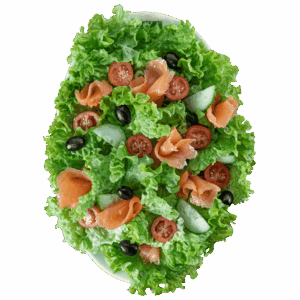 Salade, tomates, saumon, cornichons, olives
